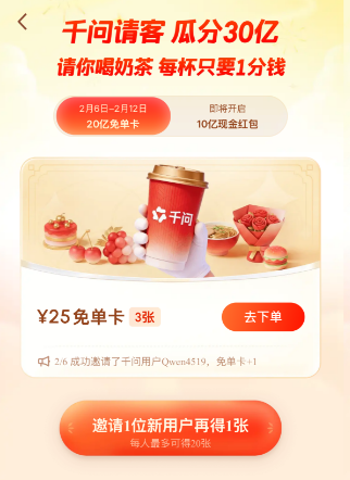 2月6日,阿里千問發起「1分錢喝奶茶」活動,引發全國性搶購狂潮,5小時內訂單量飆升至500萬單。線下奶茶店突發爆單,部分店鋪掛出甚至「暫停營業」標識。
