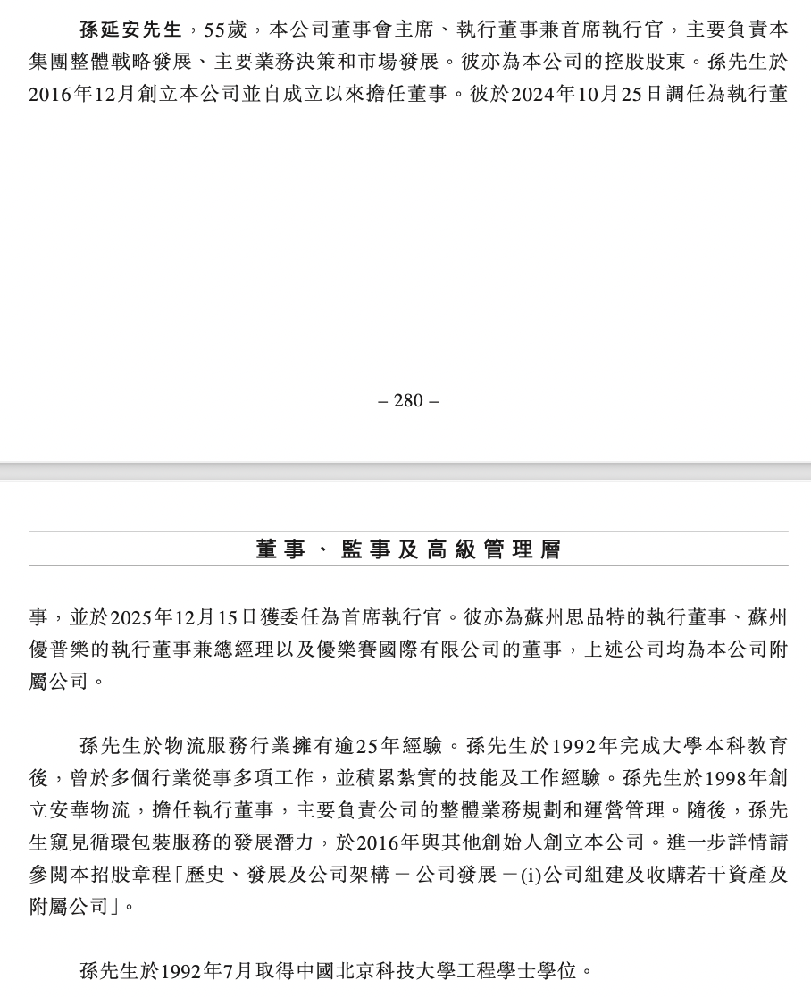 孫延安於2016年12月創立公司並自成立以來擔任董事。其於2024年10月25日調任為執行董事,並於2025年12月15日獲委任為首席執行官。其亦為蘇州思品特的執行董事、蘇州優普樂的執行董事兼總經理以及優樂賽國際有限公司的董事,上述公司均為公司附屬公司。