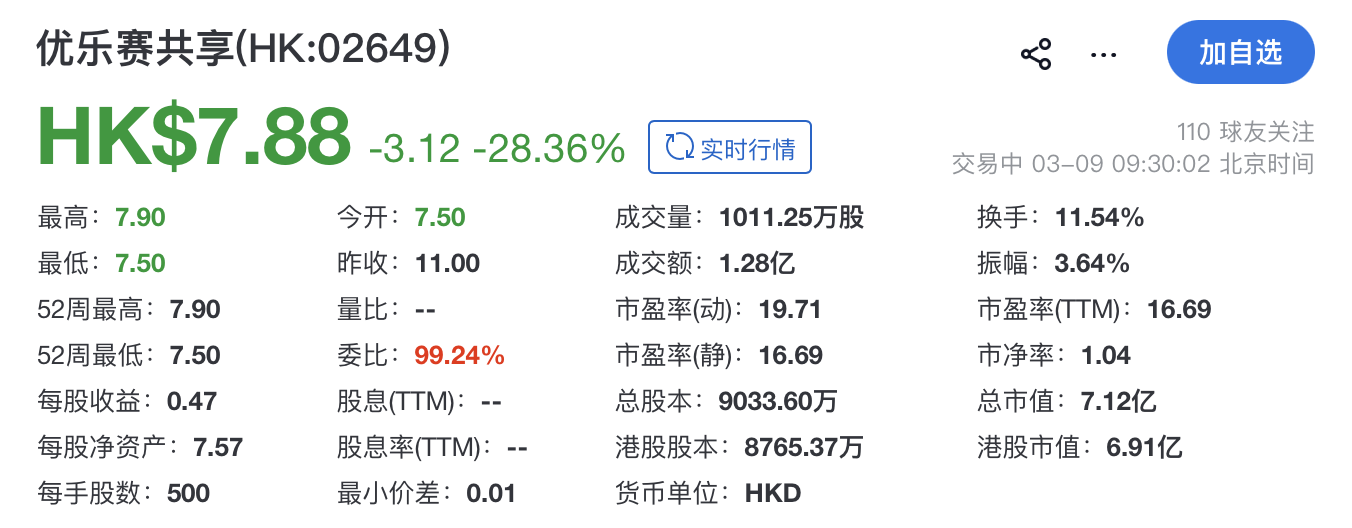 樂居財經 吳文婷3月9日,優樂賽共享(02649.HK)在港交所掛牌上市,保薦機構為中信建投國際。其開盤報7.88港元,跌28.36%,總市值約7.12億港元。
