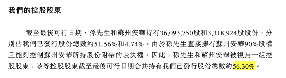 IPO前,孫延安和蘇州安華持有36,093,750股和3,318,924股股份,分別佔公司已發行股份總數約51.56%和4.74%。由於孫延安直接擁有蘇州安華90%股權且能夠控制蘇州安華所持股份附帶的表決權,因此,孫延安和蘇州安華被視為一組控股股東,該等控股股東截至最後可行日期合共持有公司已發行股份總數約56.30%。