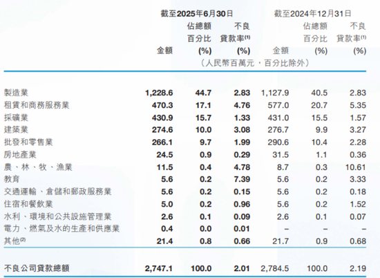 要看到,截至2025年6月30日,晉商銀行不良公司貸款主要來自製造業、租賃和商務服務業、採礦業,不良貸款率分別為2.83%、4.76%、1.33%。