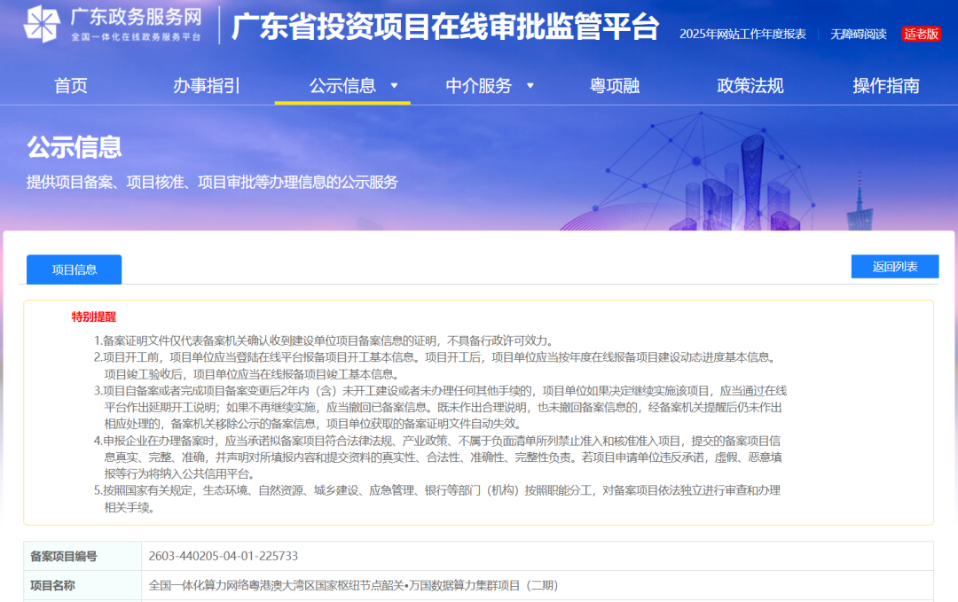 2026年3月17日,韶關市曲江區發展和改革局通過全國一體化算力網絡粵港澳大灣區國家樞紐節點韶關•萬國數據算力集群項目(二期)備案。