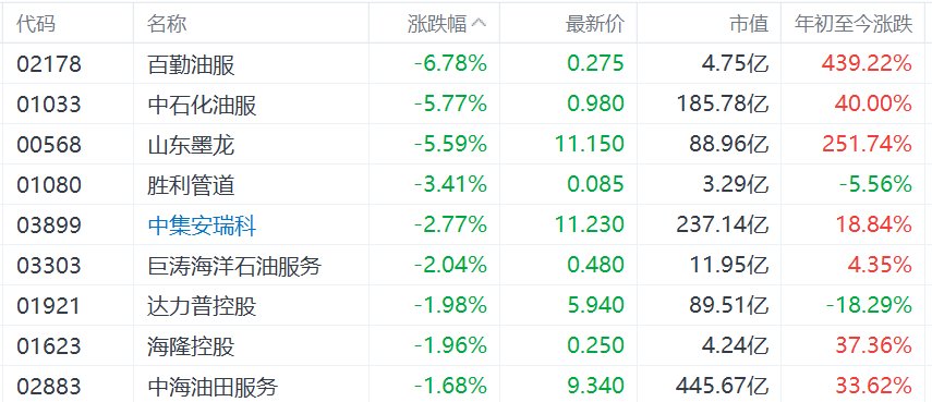 3月20日,港股市場油氣設備與服務股普跌,其中,百勤油服跌超6%,中石化油服、山東墨龍跌超5%,勝利管道跌超3%。消息面上,國際油價回調,布倫特原油昨日一度衝高至112美元后回調,收報103.07美元,今日繼續下跌,盤中一度跌至100.47美元。