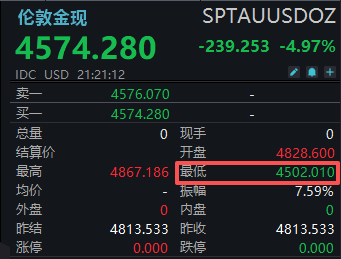 大河財立方消息,3月19日晚,貴金屬繼續下跌。倫敦金現盤中觸及4500美元/盎司,最低報4502.01美元/盎司,一日之內連續跌破4800、4700、4600美元三個整數關口。倫敦銀現盤中跌超10%。