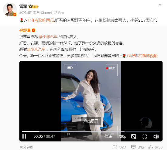 舒淇還透露會參加今晚的發布會。「今天,新一代SU7正式發布,更多想說的話話,我們發布會見咯」。