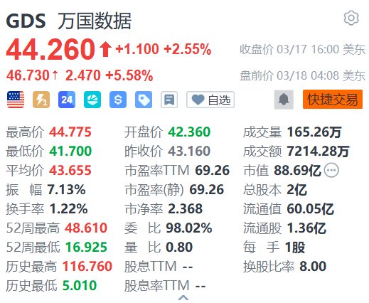 3月18日,昨日收漲2.55%的萬國數據(GDS.US)今日美股盤前續漲5.58%,報46.73美元。消息面上,萬國數據績後獲多家大行看好。其中: