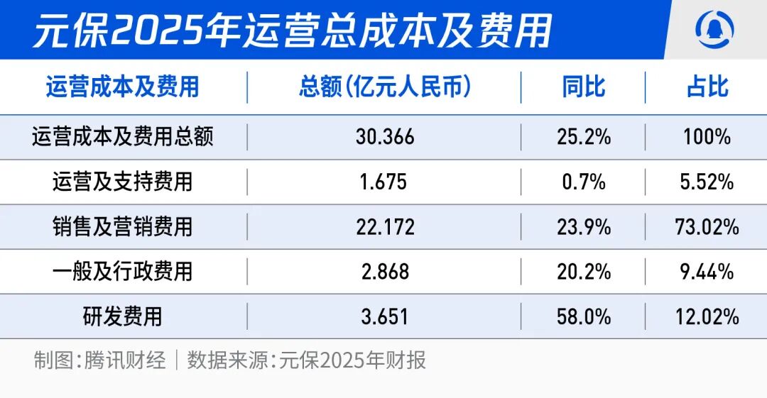 元保雖以科技公司自居,但本質上仍是保險分銷平台,盈利核心依賴保費規模和續保率。要實現規模增長,就必須依靠流量獲客,與渠道合作,這注定了其還是以銷售和營銷為主導。財務數據也印證了這一點,2023年至2025年,元保的銷售及營銷費用分別為14.62億元、17.90億元和22.17億元,在總運營成本中的佔比始終維持在70%以上。