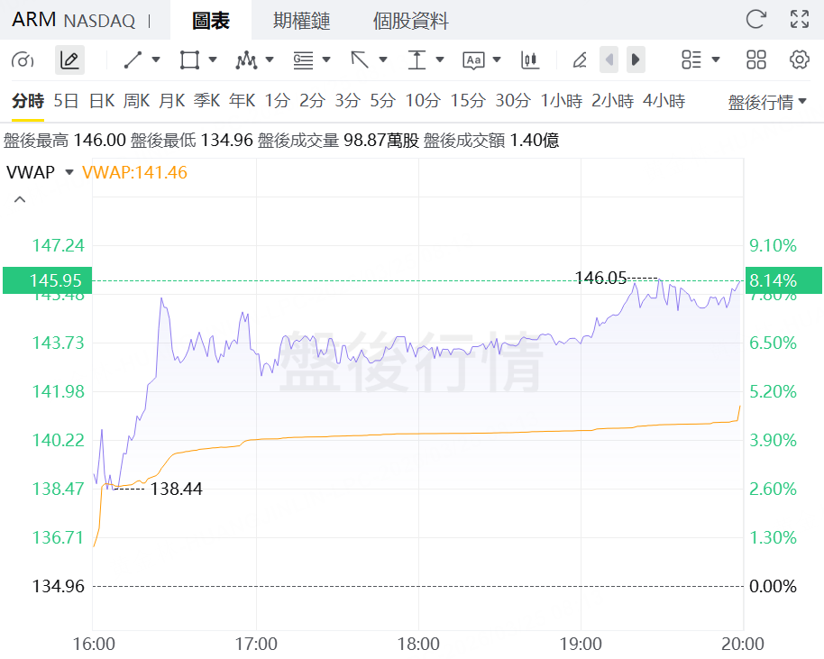 這一消息迅速引發市場關注。Arm股價在周五早盤與午盤均曾轉漲,午盤刷新日高時日內漲約2.7%,但隨後轉跌,跌幅一度擴大至2.8%以上,顯示投資者對其戰略轉型前景分歧明顯。到收盤,Arm跌約1.4%,盤後又轉漲8%。