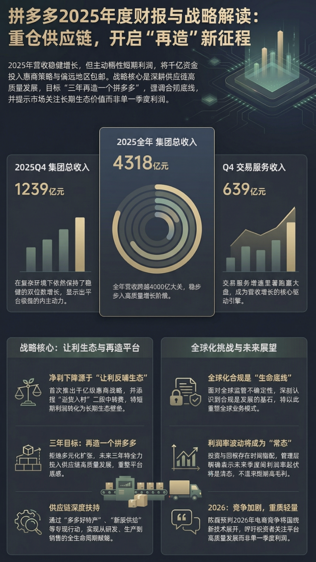 拼多多2025年四季度及全年營收保持穩健雙位數增長,但在激烈的行業競爭和複雜的全球監管環境下,公司明確宣佈主動犧牲短期利潤,以「All in」的姿態重倉供應鏈,力圖在下一個三年「再造一個拼多多」。