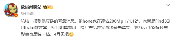 【CNMO科技消息】3月26日,數碼博主「數碼閒聊站」爆料稱,供應鏈可靠信息顯示,蘋果正在評估2億像素1/1.12英寸主攝傳感器方案,該方案正是即將於4月發布的OPPO Find X9 Ultra所搭載的影像配置。此外,後者還配備了雙2億像素傳感器及10倍超長焦鏡頭。