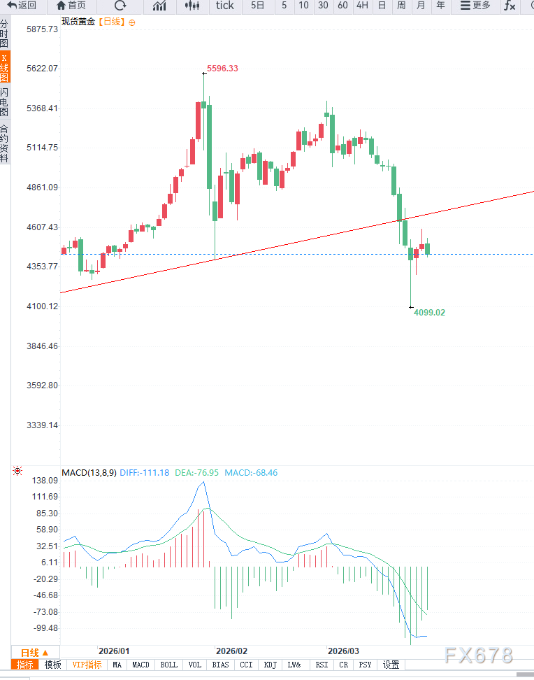 從技術面來看,日線級別上,黃金在前期觸及200日均線約4100美元后展開反彈,但當前反彈在4600美元附近明顯受阻,形成階段性壓力區。該區域同時對應關鍵均線壓制,顯示多頭上行動能不足。整體結構仍屬於反彈後的修正階段,趨勢尚未反轉。從動能指標來看,RSI維持在中性偏弱區間,表明市場缺乏持續上漲動力。在4小時周期中,價格呈現明顯的區間震盪結構,短期運行區間集中在4400美元至4600美元之間。價格多次測試上方壓力未果,同時下方支撐也較為穩固,形成典型箱體走勢。均線系統趨於粘合,MACD指標反覆交叉,顯示市場處於多空博弈階段。若價格突破4600美元,則有望進一步上探更高區域;反之若跌破4400美元,則可能引發新一輪迴調,目標指向4300美元附近。