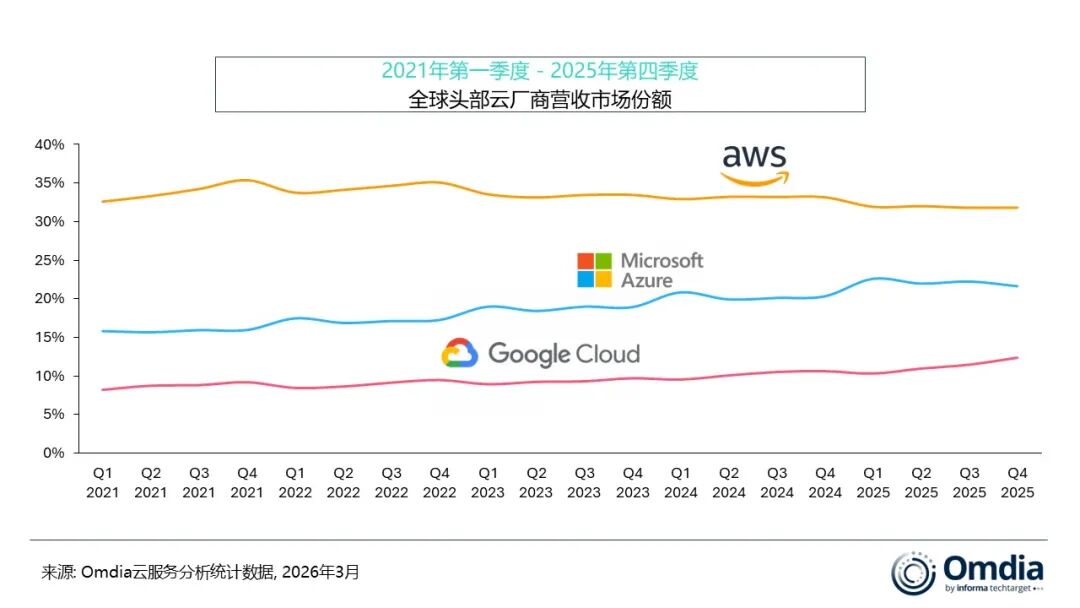 微軟Azure在2025年第四季度繼續保持全球第二大雲服務提供商的位置,市場份額為22%,營收按年增長39%。自2025年12月以來,微軟持續擴展Azure AI Foundry的模型生態,新增Mistral Large 3、GPT-5.2和Claude Opus 4.6等模型,進一步強化其作為企業級多模型AI平台的定位。與此同時,Azure正將agentic AI從模型接入延伸至企業級執行層。2026年2月推出的 agentic 雲運維能力,將Azure Copilot擴展至雲運維與持續優化場景;而3月在Azure Copilot與GitHub Copilot 中引入的新一輪 agent 能力,則進一步將應用現代化整合進端到端工作流體系。在基礎設施方面,微軟於2026年2月宣佈其沙特阿拉伯東部數據中心區域將於2026年第四季度正式啓用,進一步拓展其本地化雲與AI基礎設施佈局。