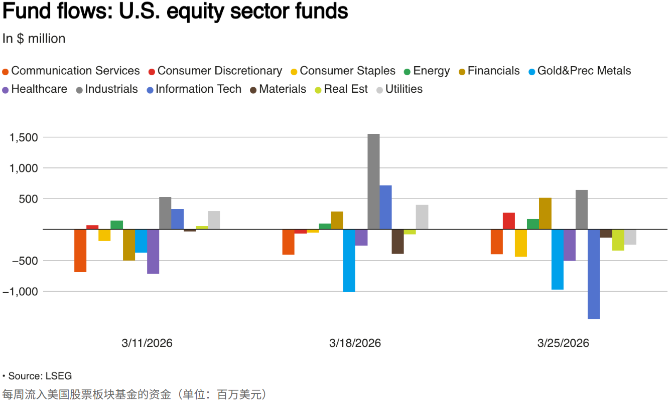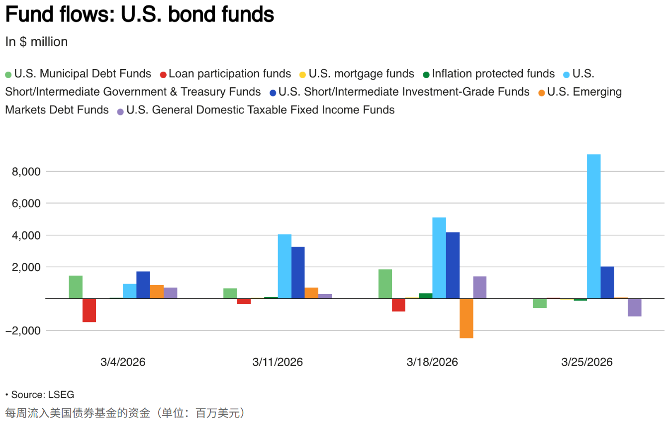 在截至 3 月 25 日的一周內,由於美國總統特朗普推遲了對伊朗能源基礎設施的襲擊並提出了一項結束戰爭的協議,中東局勢降溫的希望提振了市場情緒,美國股票基金吸引了強勁的資金流入。