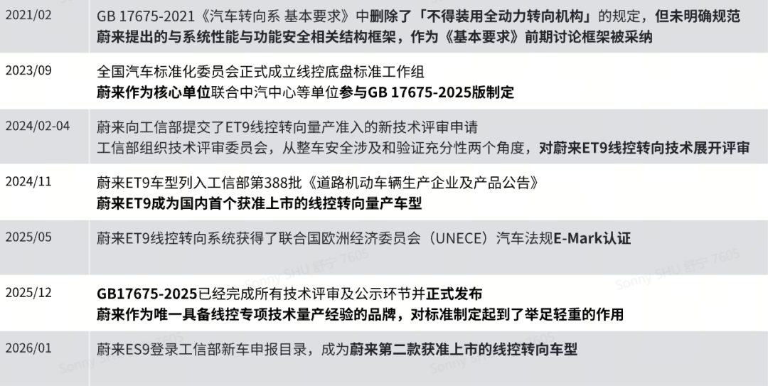 2024年12月9日,蔚來ET9獲得工信部線控轉向技術量產許可,2025年3月蔚來ET9開啓正式交付,自此中國有了第一款量產線控轉向技術的車型。2025年12月2日,蔚來作為牽頭單位之一,聯合中國汽車技術研究中心等行業機構共同發布了GB17675-2025《汽車轉向系 基本要求》線控轉向系統(SBW)國家標準,標誌着國內智能底盤核心技術在標準化與先進性層面實現重大突破。從航空航天領域到汽車產業,這場歷時二十餘年的技術遷移,在智能電動汽車時代迎來了關鍵的產業化突破。