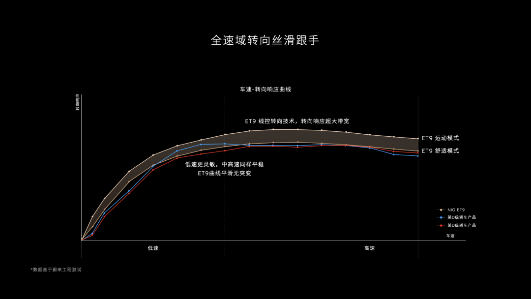 也正是得益於線控轉向的加持,能夠在超帶寬下靈活調整,兩種調校風格不僅僅侷限於手感和回正力度的差異,更是能實現兩種轉向響應曲線,無論什麼場景下都可以匹配最佳轉向響應,在舒適與運動、低速靈敏和高速穩定之間平滑過渡不突兀,而這也只有依賴蔚來工程團隊的細緻打磨才能實現。