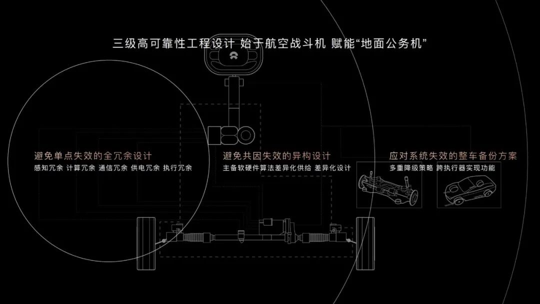 一切用車體驗的前提,一定是安全性的保障。蔚來在可靠性上參照了航空業的成熟經驗,採用了三級可靠性工程設計,對潛在的隱患層層設防。