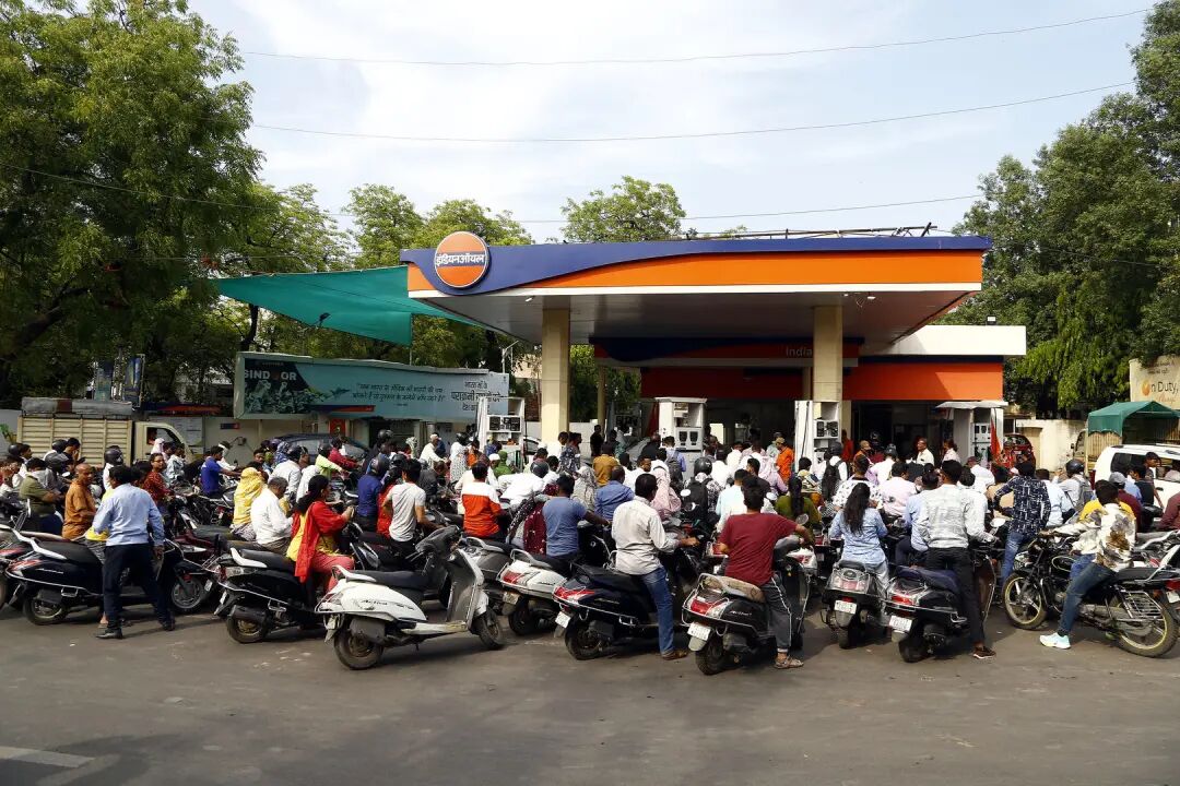 ▲當地時間2026年3月23日,印度艾哈邁達巴德,民衆在一家加油站排隊等待加油 圖據視覺中國