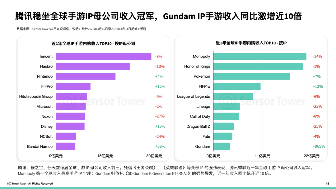 騰訊、孩之寶、任天堂穩居手遊IP母公司收入前三。騰訊憑藉王者榮耀、英雄聯盟等IP的突出表現,穩居收入冠軍。Monopoly坐穩收入最高的手遊IP寶座,高達(Gundam) IP則得益於回合制策略手遊《SD Gundam G Generation ETERNAL》的強勢崛起,近1年收入按年暴漲近10倍。