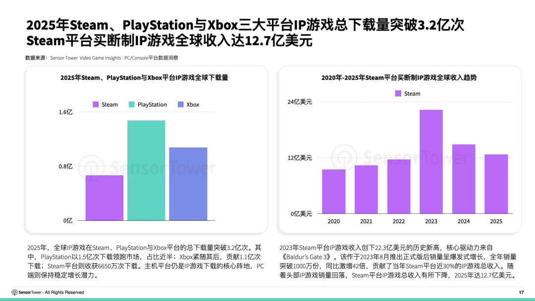 得益於《Baldur’s Gate 3》正式版的上市和爆火,Steam平台IP遊戲收入在2023年創下歷史新高。隨着頭部IP遊戲銷量回落,Steam平台IP遊戲總收入有所下降,2025年達12.7億美元。
