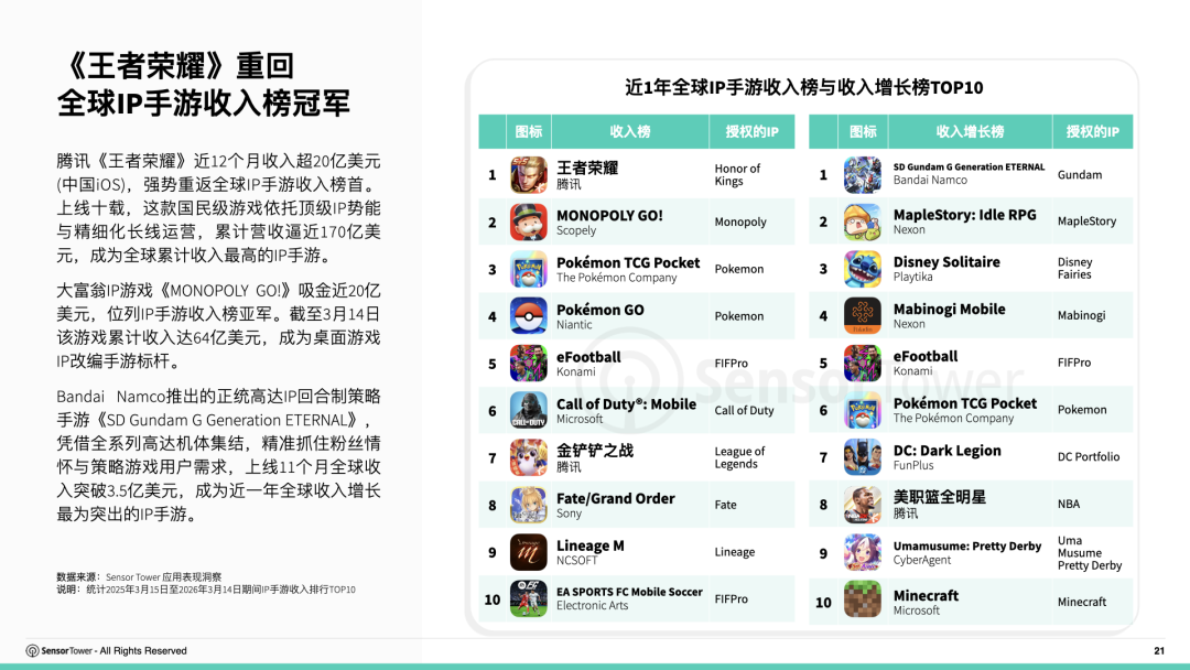 《王者榮耀》重回全球IP手遊收入榜冠軍