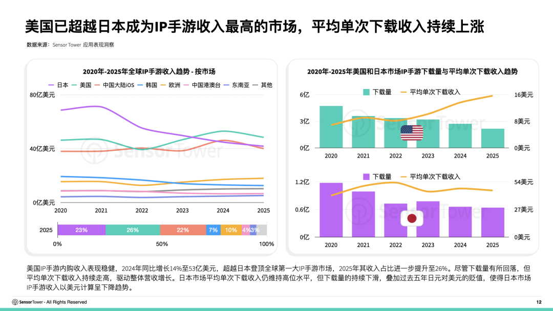美國IP手遊內購收入表現穩健,2024年按年增長14%至53億美元,超越日本登頂全球第一大IP手遊市場,2025年美國市場收入佔比進一步提升至26%。儘管下載量有所回落,但平均單次下載收入持續走高,驅動整體營收增長。