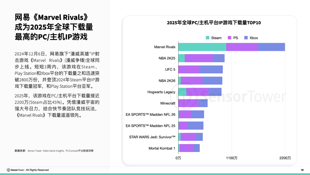 網易於2024年12月推出的「漫威英雄」IP射擊遊戲《Marvel Rivals》,憑藉漫威宇宙的強大號召力,結合快節奏團隊競技玩法,2025年在PC/主機平台下載量接近2200萬(Steam佔比45%),成為當年全球下載量最高的PC/主機IP遊戲。