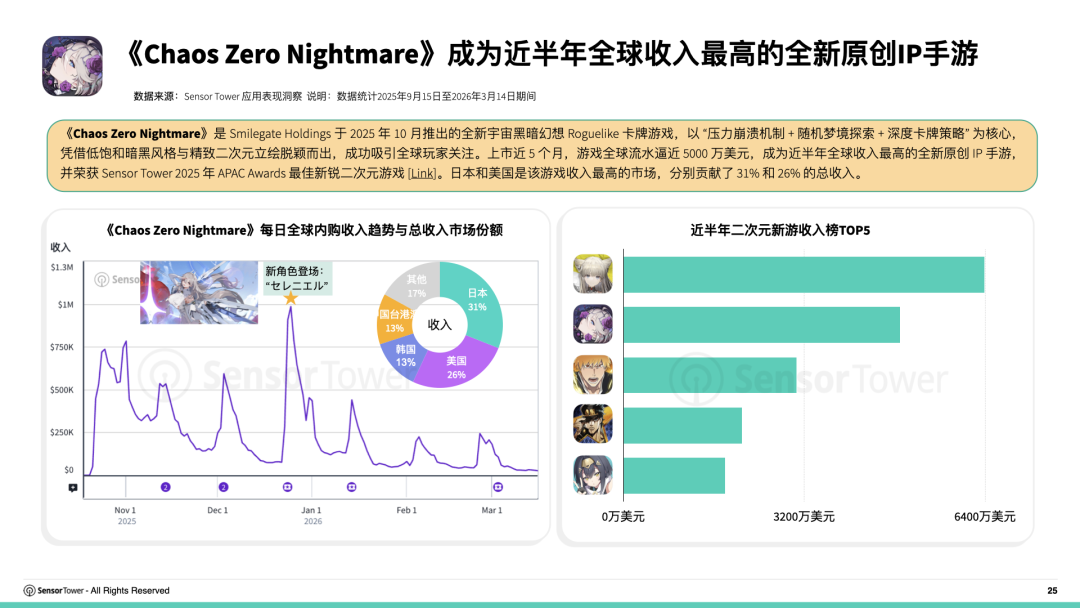 上市近5個月,遊戲全球流水逼近5000萬美元,成為近半年全球收入最高的全新原創IP手遊,並榮獲Sensor Tower 2025 年 APAC Awards 最佳新銳二次元遊戲。日本和美國是該遊戲收入最高的市場,分別貢獻了31%和26%的總收入。
