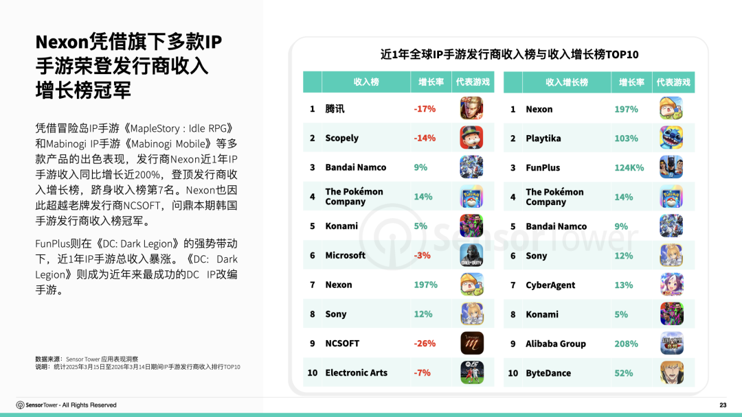 憑藉冒險島IP手遊《MapleStory : Idle RPG》和Mabinogi IP手遊《Mabinogi Mobile》等多款產品的出色表現,發行商Nexon近1年IP手遊收入按年增長近200%,登頂發行商收入增長榜,躋身收入榜第7名。Nexon也因此超越老牌發行商NCSOFT,問鼎本期韓國手遊發行商收入榜冠軍。