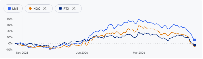 Lockheed Martin、Northrop Grumman、RTX等美國主要軍工股價自3月以來均下挫。與此同時,近10億美元資金撤離了規模達140億美元的iShares美國航空航天與防務ETF,轉而流向能源和公用事業等避險板塊。