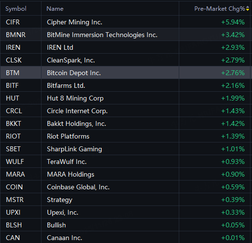 Cipher Mining rose 6%; BMNR, CleanSpark, Iren rose 3%; Bitfarms rose 2%; Circle, SBET, MARA rose 1%