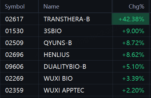 Biomedical stocks surged in Hong Kong. TransThera Sciences rose 42%; 3SBio, Qyuns Therapeutics, and Henlius Biotech rose 9%; Duality Biotherapeutics rose 5%; WuXi Biologics rose 3%; WuXi AppTec rose 2%.