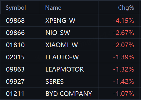 EV stocks sank in Hong Kong. XPeng fell 4%; NIO fell 3%; Xiaomi fell 2%; Li Auto, Leapmotor, Seres, and BYD fell 1%.