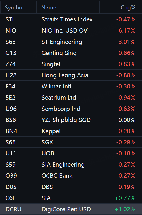 Singapore stocks opened lower on Friday. STI fell 0.5%; NIO fell 6%; ST Engineering fell 3%; Singtel fell 0.8%; Genting Singapore fell 0.7%; DBS and UOB fell 0.2%; SIA rose 0.8%.