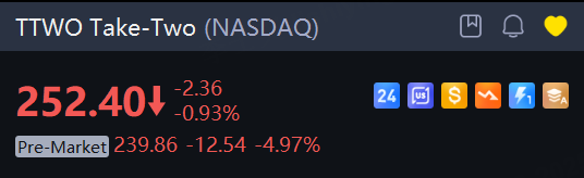 Take-Two shares sank 5% after Rockstar Games announced a further delay in the release of Grand Theft Auto VI to November 2026.