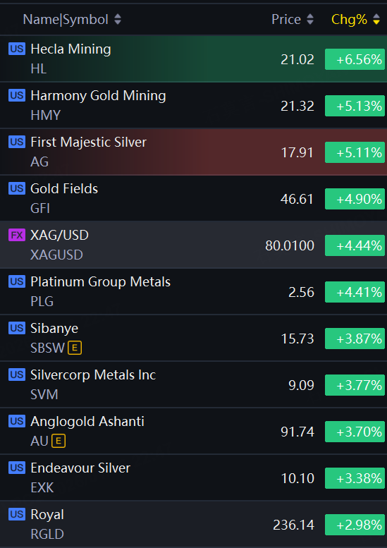 Precious Metals Shares Shine. Spot Silver Rises over 4% to $79.95/Oz While Spot Gold Jumps to $4,485/Oz. Helca Mining up over 6%; Harmony Gold, AG up over 5%