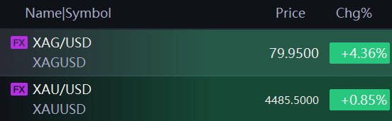 Spot silver rose 4.36% to $79.95 per ounce while spot gold rose 0.85% to $4,485.5 per ounce.