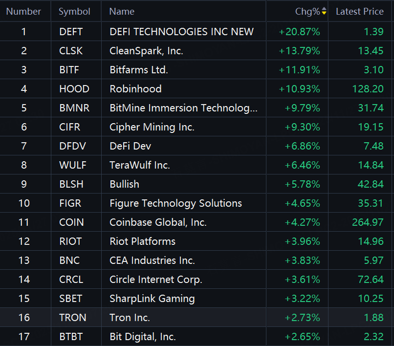 Crypto shares rose on Wednesday. Defi Tech up 21%; CleanSpark up 14%; Bitfarms up 12%; Robinhood up 11%; BitMine up 10%; Cipher Mining up over 9%.