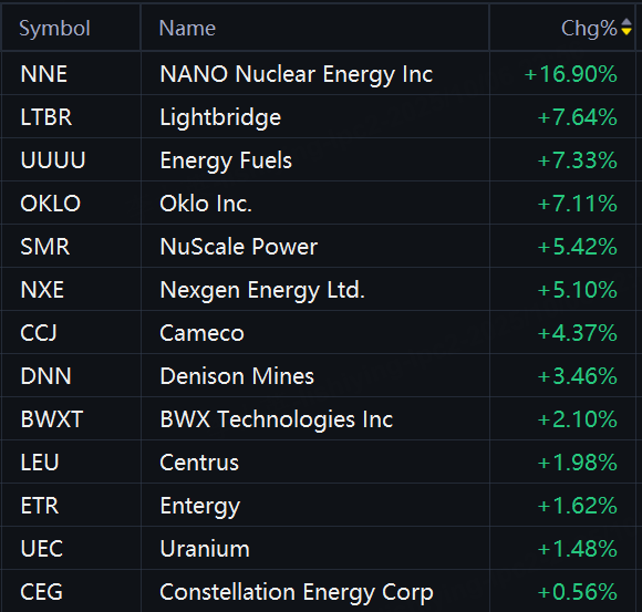 Nuclear energy stocks jumped in morning trading. NANO Nuclear Energy rose 17%; Lightbridge rose 8%; Energy Fuels and Oklo rose 7%; NuScale Power and Nexgen Energy rose 5%; Cameco rose 4%; Denison Mines rose 3%;