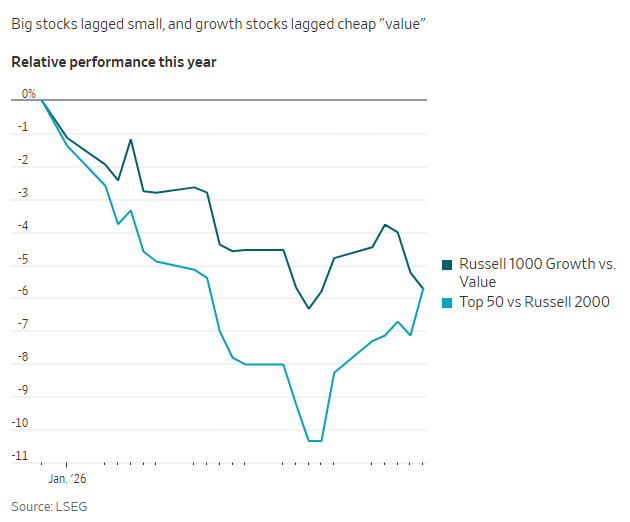 The same happened for the past couple of months as investors fell out of love with Big Tech’s spending on artificial intelligence. Then this year small stocks smashed the biggest, silver surfed a wave of private buying and gold jumped 21.8% in the first 21 trading days of the year, the most over such a period since late 1999. Copper was already on a roll thanks to data-center construction, but since November soared another 20%, before having its worst day on Friday since the Trump tariffs last April.