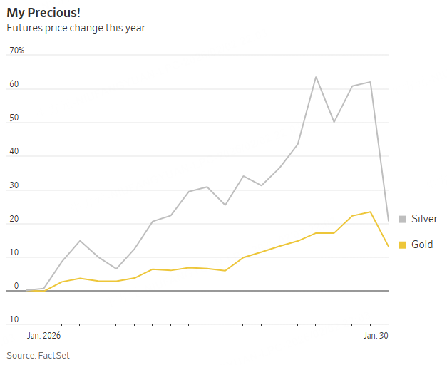 Prices moved on the day mostly as you should expect from the selection of a hard-money hawk, or the avoidance of a soft-money dove: Stocks, gold and silver fell; the dollar and long-term Treasury yields rose. The exception came from the nuance that Warsh wants to sell the Fed’s stockpile of Treasurys, but has turned dovish on interest rates, so 2-year Treasury yields fell a little.