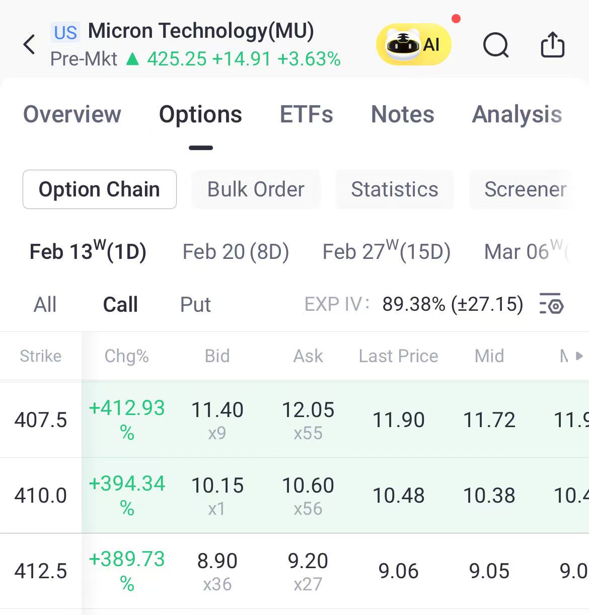 A total number of 577.11K MU option contracts was traded on Wednesday, of which 63% were call options. Call options related to Micron showed huge gains on Wednesday. For example, the $410 strike call options expiring this week soared 394.34% on Wednesday.