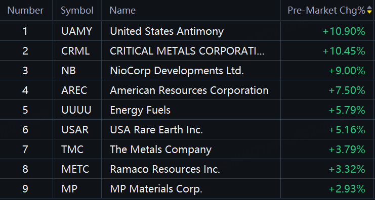 Rare earth stocks advanced in premarket trading. Critical Metals, UAMY over 10%; NioCorp up 9%; American Resources up over 7%; USA Rare Earth, Energy Fuels up over 5%.