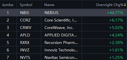 Nvidia Concept Stocks Jumped in Overnight Trading; Nebius up 45%; Core Scientific up 6%; CoreWeave up 5%; Applied Digital up 4%.