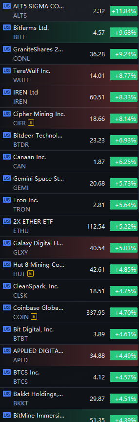 Crypto Shares Kept Shining. ALT5 Up 12%; Bitfarms Up 10%; TeraWulf, Iren, Cipher Up 8%; Canaan And Bitdeer Up 6%