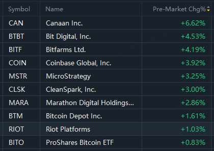 Crypto stocks gained in premarket trading. Canaan rose 7%; Coinbase, Bitfarms rose 4%; MicroStrategy rose 3.3%; CleanSpark, Marathon Digital rose 3%; Riot Platforms rose 1%.