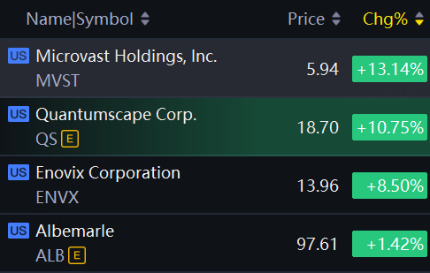 Lithium stocks jumped on Wednesday. Microvast up 13% while Quantumscape up 11%, both hitting record highs. Enovix up over 8%.