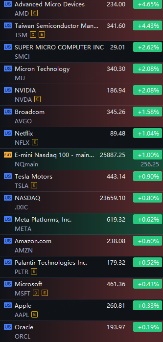 Big Tech Stocks Shined. AMD and TSMC up 4%; SMCI, Micron and Nvidia up 2%; Broadcom and Netflix up 1%.