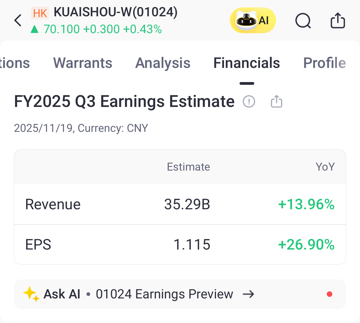 Earnings Preview: Market Expects KUAISHOU Q3 Adjusted EPS to Increase by 26.90%, Focus on AI Business Growth Momentum and Profit Performance