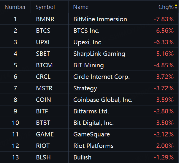 Crypto shares fell on Tuesday. BitMine down 8%; BTCS, Upexi down over 6%; SBET, BTCM down about 5%; Circle, Strategy, Coinbase down over 3%.