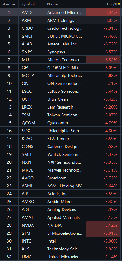 Chip Stocks Plunged. AMD, ARM and Credo down 8%; SMCI down 7%; Astera, Synopsys, Micron and Globalfoundries down 6%; TSMC and Qualcomm down 5%; Nvidia down 3%.